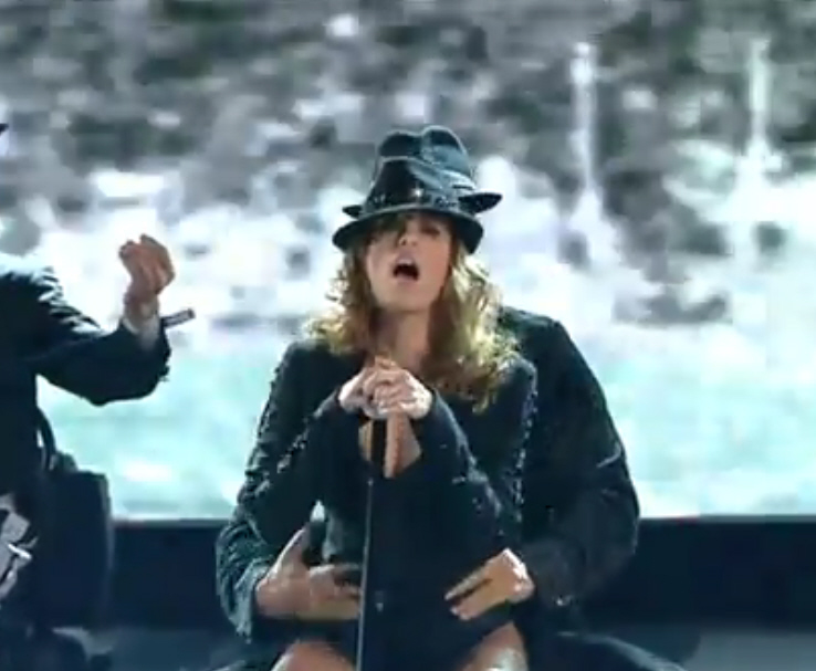 [From The Mail] Which sounds… cheesy, right? Just wait. There's video too. And now that I've watched the video… I have to say, I understand exactly why George Clooney is with this woman. It's not just that her maternal instincts are satisfied with her dog (or Clooney in a dog collar). It's this. She's the kind of girl who will give this kind of stage "performance": She really does have a spectacular ass. Like, that alone is enough to get her a ticket to The Clooney Show, but now there's no question as to why they've been together for nearly two years. Lap dances. Leather, fishnets, great ass and lap dances. Oh, and even though the girl's body is insane and she's pretty sexy (in a trashy way), she can't dance. Like, she's totally off cue the whole way through. Photos from the Sanremo festival, courtesy of WENN. Additional screen caps from the video are mine. |