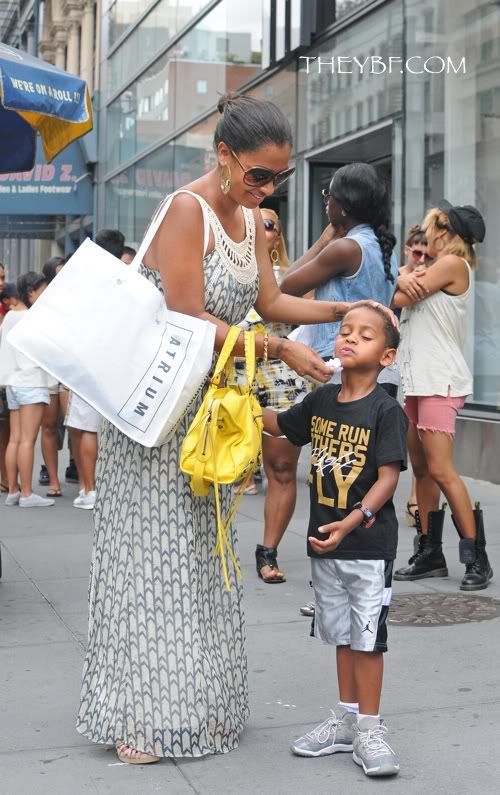 Too cute! Kiyan's mom LaLa, who switched up from heels to easy flats during the outing, is set to star in the upcoming film Think Like A Man. And also hit up the Hamptons on Saturday night for Russell Simmons' Art for Life benefit. Pics via SPLASH |