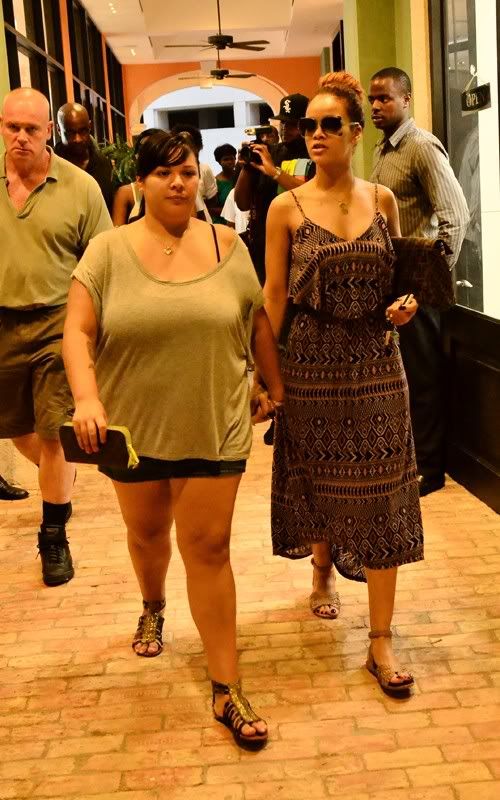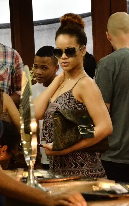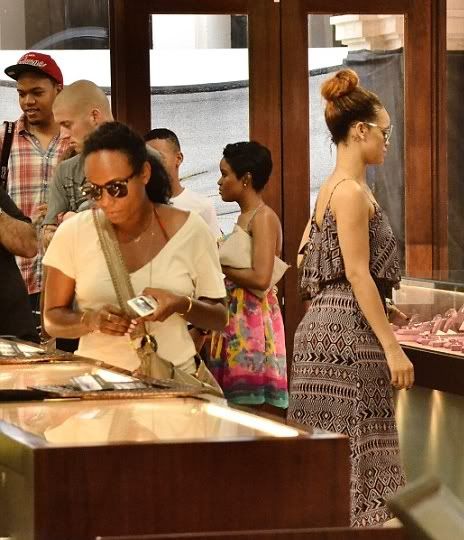 After being named the official ambassador of tourism to her home island of Barbados, Rihanna announced she would wrap up her LOUD tour in her hometown of Bridgetown in the country. So she rolled in to Barbados yesterday ahead of her August 5th performance. She tweeted hr fans that she missed them saying, "My home, my country, my people....BARBADOS!!! #1LOVE#SWEETfahDAYS NOTHIN' BETTER! #RihannaNavy Miss u guys tho." And shopped it up for jewelry in a cute maxi dress with her little bros Rajad (spotted below) and Rory, and her girl Jennifer: